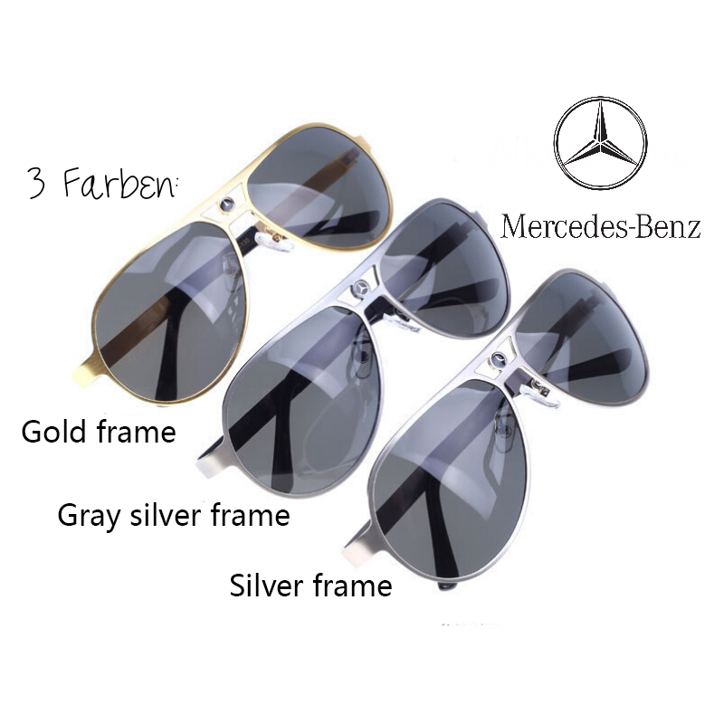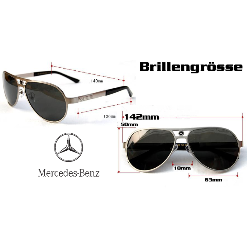Mercedes-Benz Sonnenbrille mit Metallrahmen und Mercedes-Benz Logoplättchen auf beiden Bügeln. Hochwertige Gläser, einem stylischem Benz Logo in der Mitte der Sonnenbrille, 100 % UV-A-, UV-B- und UV-C-Schutz bis zu 400 nm.