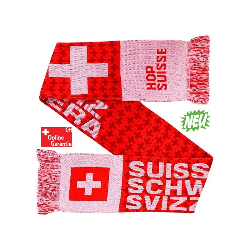 Mit dem markanten Suisse Schweiz Svizzera bzw. eine Seite mit Hopp Schwiiz und Hop Suisse Schriftzug und den Schweizerkreuzen eignet sich dieser Schal perfekt für das nächste Spiel der Nati!