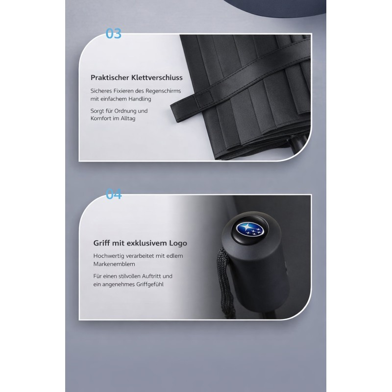 Windfester Subaru Automatik-Regenschirm mit robustem 12-Streben-Stahlgestell, komfortabler Auf-Zu-Funktion und wasserdichtem Schutzüberzug für Ihr Auto. Der ergonomische, rutschfeste Griff mit edlem Logo bietet sicheren Halt und macht diesen kompakten Taschenschirm zum idealen Begleiter für unterwegs