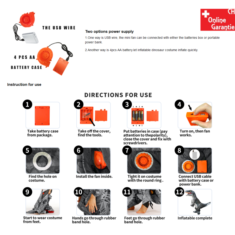 Einmal angeschaltet, bläst sich der Raptor in wenigen Sekunden auf – und bleibt dank konstantem Luftstrom schön in Form. Betrieben wird das Ganze mit 4 AA-Batterien (nicht enthalten) oder bequem per Powerbank (USB).