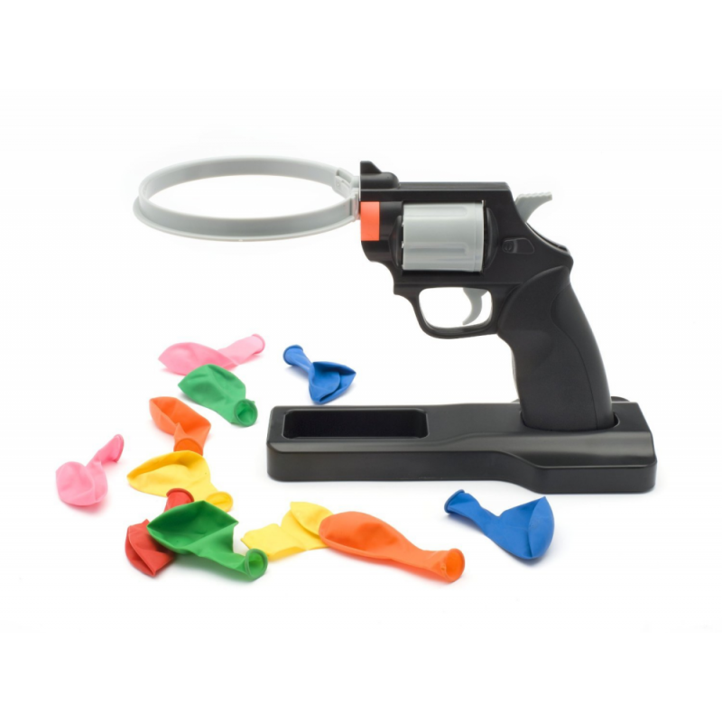 Weniger „päng, päng, du bist tot“, mehr „boing, pop, du bist etwas taub“. Dieses Russische Luftballon Roulette ist eine harmlose Version des klassischen russischen Roulette, wobei kein Blut fliesst und die Entsorgung des Körpers wegfällt. Ideal als Geburtstags- und Weihnachtsgeschenk und beinhaltet eine „Waffe“, welche mit einem Ballon geladen werden kann und wird so zum idealen Partyspiel für jede Gelegenheit. Alternativ kann vor dem aufblasen in die Ballone auch Schlagsahne oder Schokosauce gegeben werden, was das ganze etwas chaotischer, aber zugleich noch lustiger gestaltet :)