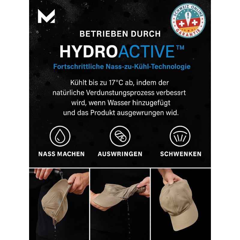 HydroActive™ Kühltechnologie: Wet it, Wring it, Wave it – und Ihr Kopf bleibt bis zu 17°C kühler als der Rest von Ihnen. Ja, Sie haben richtig gelesen, 17°C cooler. Die Cap ist also im Sommer der coolere von beiden – selbst wenn Ihre Lebensgeister bei 35°C dahinschmelzen.