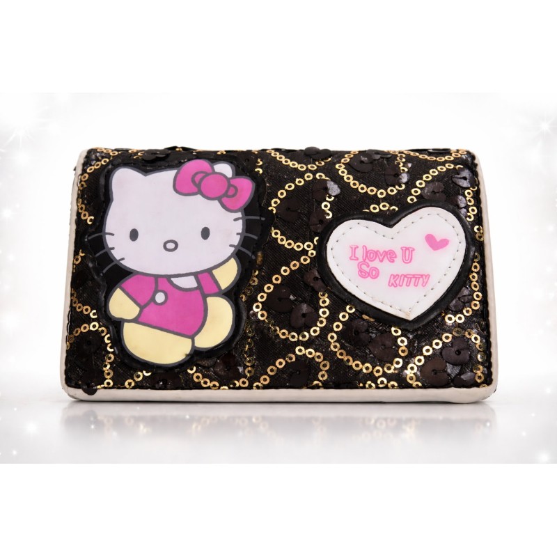 Suchen Sie ein stilvolles und zugleich verspieltes Accessoire für den Alltag? Dieses süsse Hello Kitty Portemonnaie vereint ein auffälliges Design mit hoher Funktionalität. Die schwarze Oberfläche ist mit eleganten, kreisförmigen Mustern aus goldenen Pailletten verziert. Auf der Vorderseite befindet sich ein klassisches Hello Kitty Motiv sowie ein weisses Herz mit dem rosafarbenen Schriftzug "I love U So KITTY".