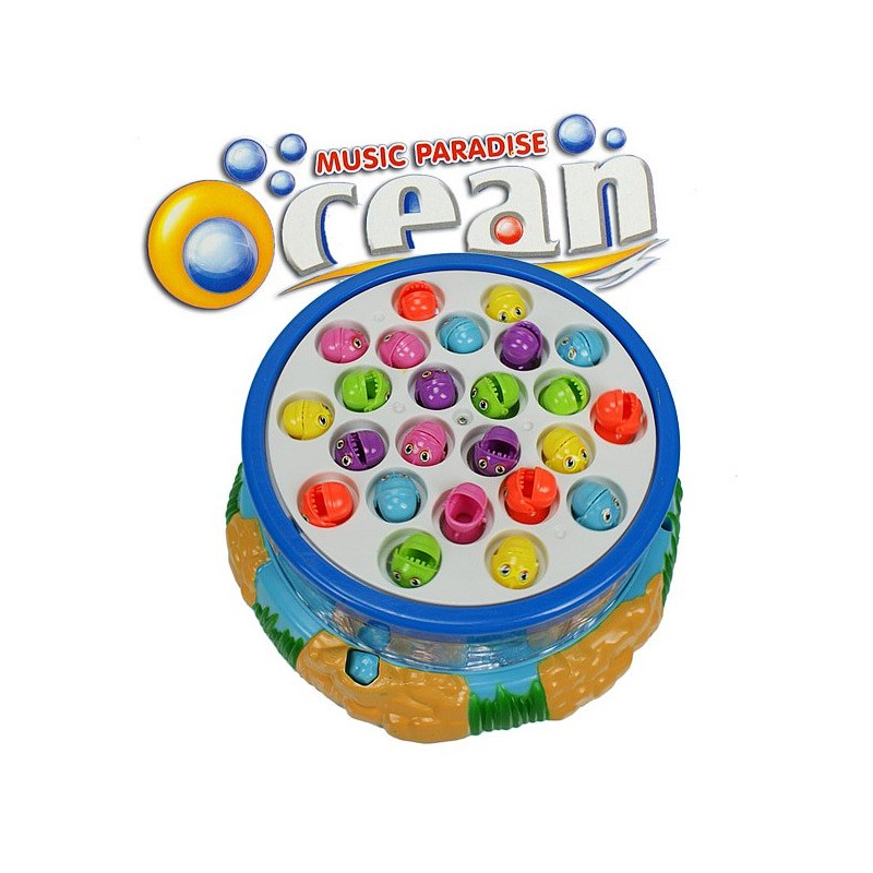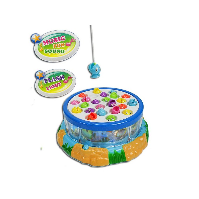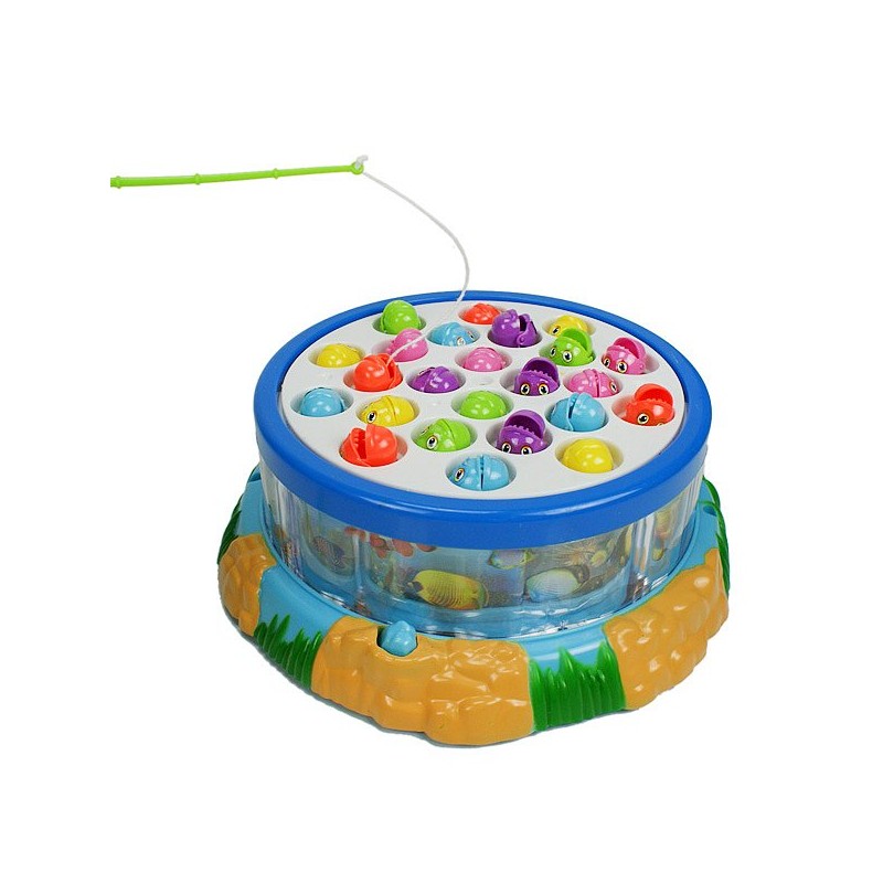 Mit unserem Angelspiel für zwei können Ihre Kids ihre Geschicklichkeit trainieren. Die Fische im rotierenden Bassin hüpfen zur Musik auf und ab und schnappen nach dem Köder. Dabei muss man schnell genug sein, damit sie einem nicht wieder vom Haken springen. Ein großer Spass für alle kleinen Angelfreunde!