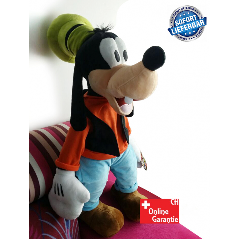 Grosses Goofy Kuscheltier mit etwa 75 cm Höhe. Weicher Plüsch, liebevolle Details und ein fröhlicher Ausdruck. Ideal zum Kuscheln und als Geschenk für Fans von Goofy und Micky Maus