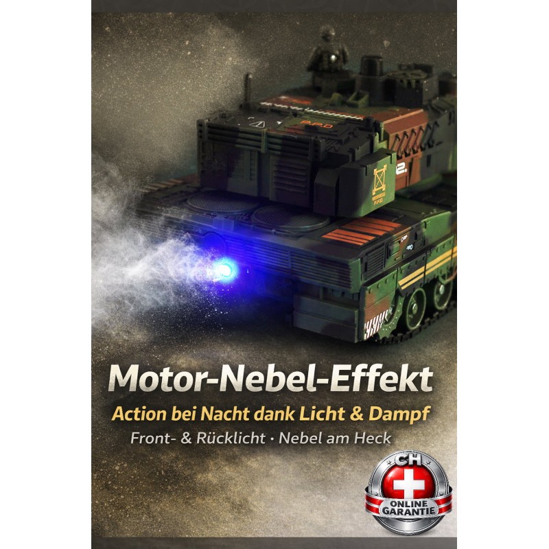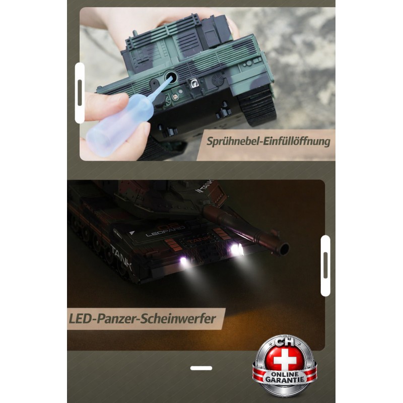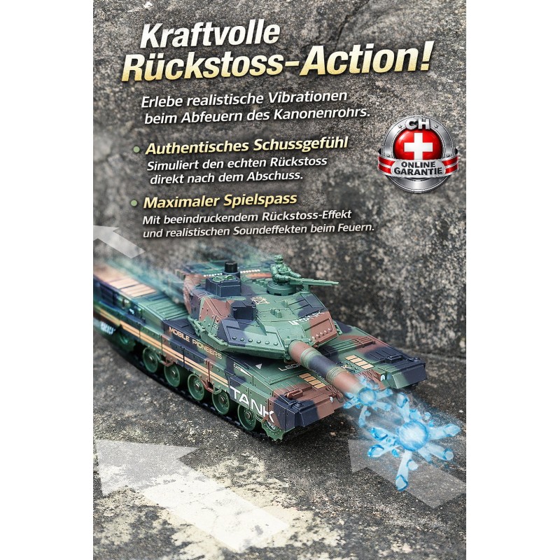 Ferngesteuerter 2.4G RC Tank im Massstab 1:24 mit authentischem Camouflage-Design. Dieser Panzer verschiesst Wasser-Gelkugeln und bietet realistische Effekte wie Rückstoss, Sound und Wasserdampf-Nebel. Geländegängig dank Einzelradaufhängung: ideal für Action im Freien