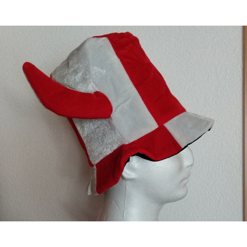 Chapeau rouge et blanc en peluche avec cornes. Parfait pour supporters & fêtes.