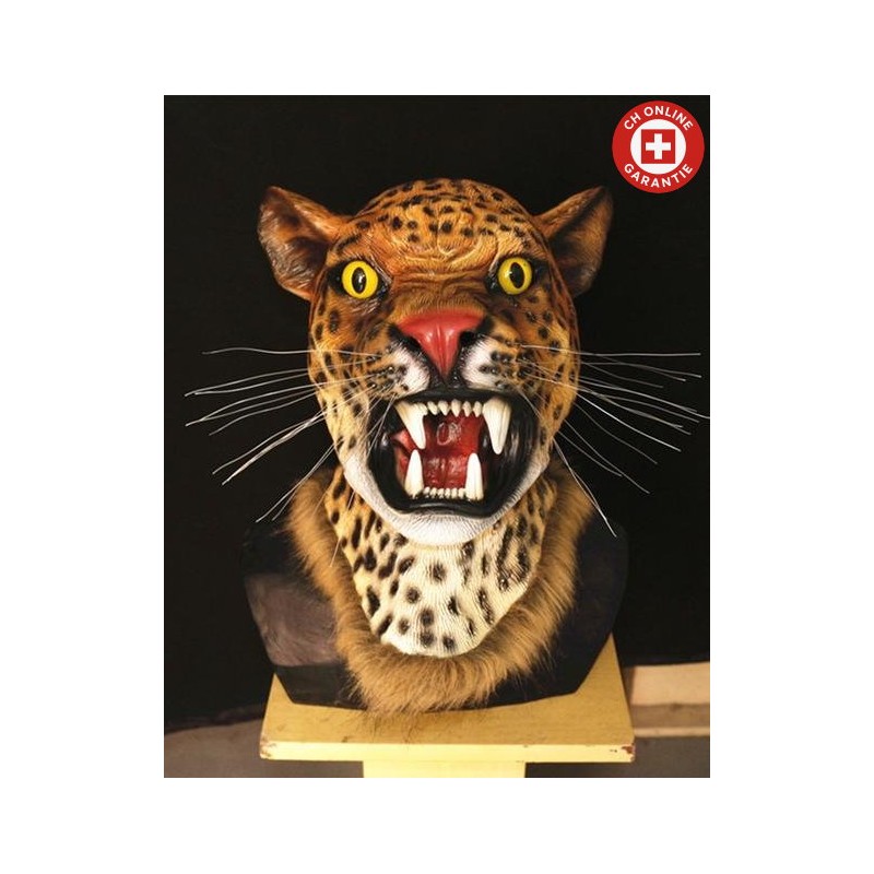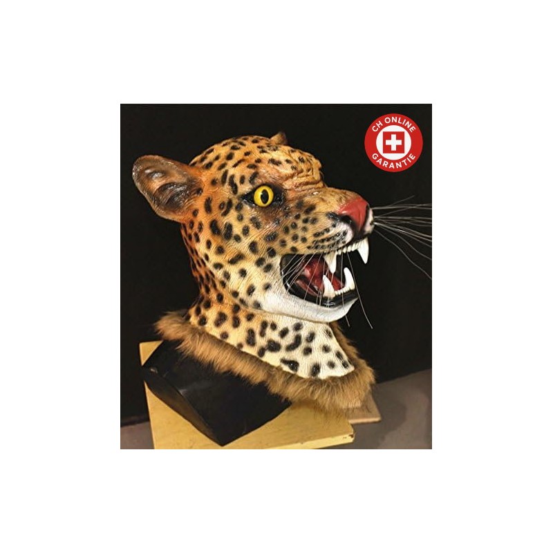 Le masque est fabriqué en latex flexible qui s’adapte à votre tête comme une seconde peau sauvage. Le motif tacheté brun et noir est si crédible que les zoologues pourraient douter. Les yeux jaunes brillent d’un éclat malicieux et la gueule grande ouverte, garnie de dents pointues, garantit l’effet de surprise. Un col en fausse fourrure cache la transition vers le costume pour un rendu sans faille. Celui qui vous croise pense plus à l’heure du repas qu’à entamer une conversation.