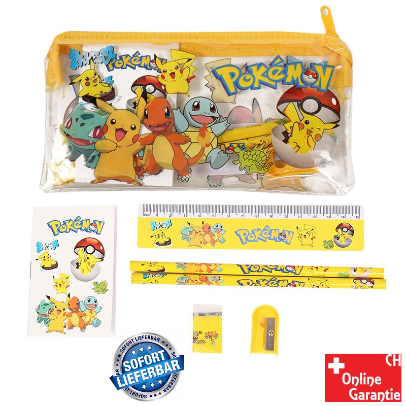 Un superbe 7 pièces. Set pour tous les petits amis Pokémon. Sac transparent avec motif Pokémon et fermeture éclair. Également inclus : deux crayons, une règle, des autocollants, un taille-crayon, un petit bloc et une gomme, le tout dans un joli design Pokémon.