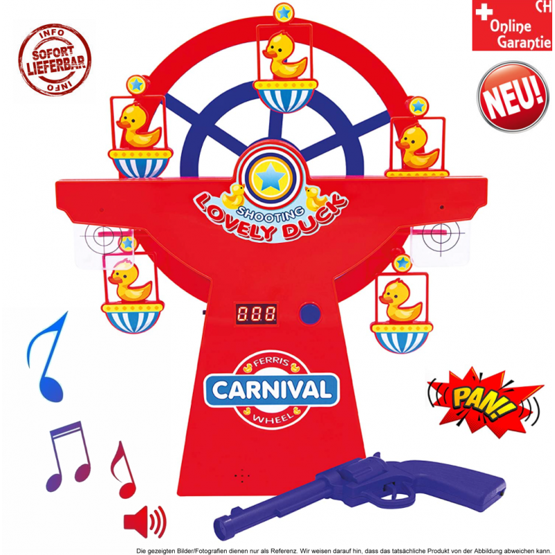 Le temps des marchés de Noël est révolu depuis longtemps et les soirées deviennent de plus en plus longues... Malheureusement, il n'y aura pas de foire à proximité dans un avenir proche ? Hmmm... C'est triste. Mais gardez la tête haute car vous savez comment faire plaisir à vos amis, notamment avec une partie de tir au canard. Alors ramenez l'excitation à la maison avec la grande roue "Duck Shoot", car ce stand de tir miniature ressemble non seulement à un véritable stand de tir forain, mais fonctionne aussi comme ça... Et voici comment cela fonctionne : Vous prenez le pistolet et visez les ennemis - Alors les petits canetons jaunes qui passent devant le tapis roulant - et si vous en aviez un en ligne de mire ? Appuyez sur la gâchette ! Vous obtenez des points pour chaque oiseau que vous tuez !