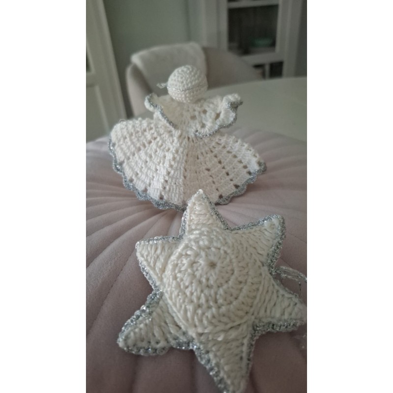 Décoration de Noël artisanale avec un ange en crochet de onze centimètres et une étoile assortie en blanc crème, bordure argentée. Cadeau idéal pour Noël
