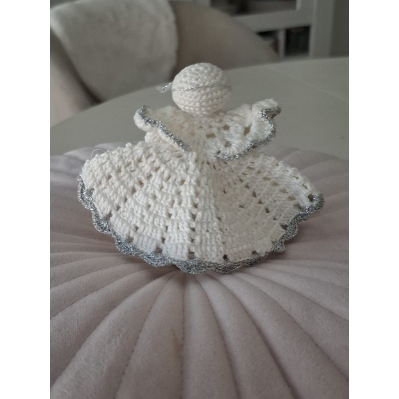 L’ange présente une forme en cloche avec une structure de crochet fine. La tête est crochetée de manière stable. De petites ailes complètent la silhouette. La finition soignée donne une présence douce et élégante.