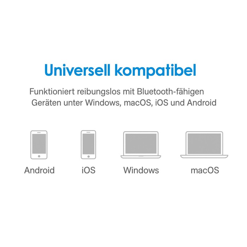 Ce clavier Bluetooth sans fil QWERTZ séduit par son design fin et sa compatibilité universelle. Avec un poids d’environ 280 grammes et des dimensions de 28,5 × 12,1 × 2 centimètres, il se glisse facilement dans votre sac. Il est parfait pour une utilisation mobile et vous accompagne partout.