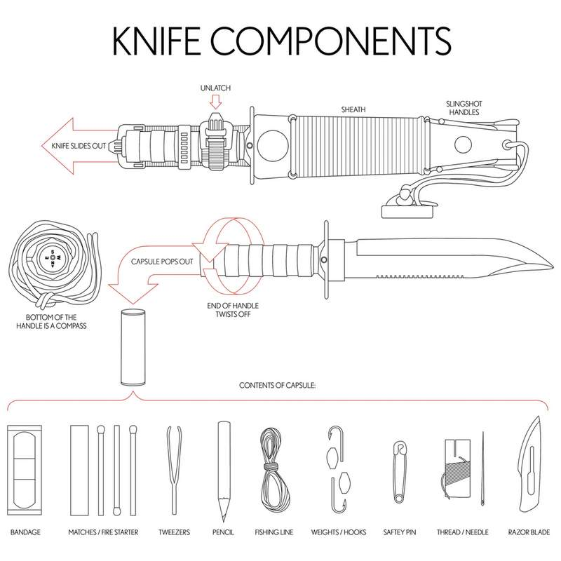 Capsule dans le manche contenant des outils de survie utiles
